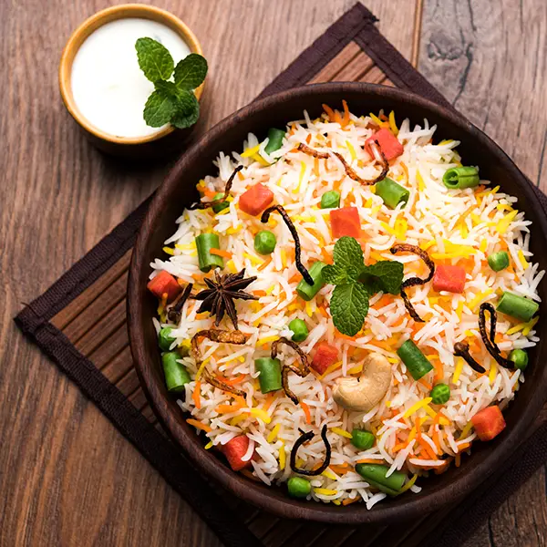 Vegetable Biryani is a fragrant dish layered with seasoned vegetables and long-grain basmati rice. This biryani is a customer favourite and pairs wonderfully with raita or curry sauce.